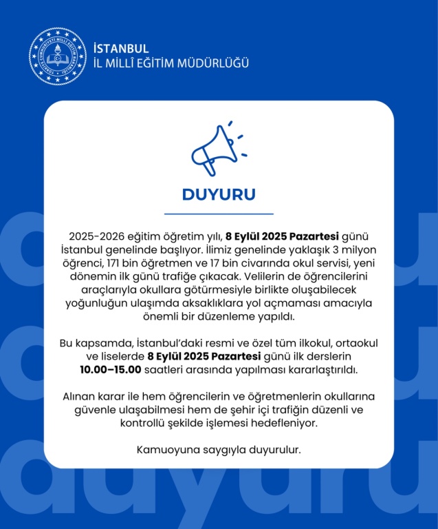 İstanbul İl Milli Eğitim Müdürlüğünün kararı doğrultusunda 8 Eylül Pazartesi İstanbul genelinde ders başlama saat:10:00, ders bitiş saati:15:00 olarak belirlenmiştir. Duyuru görseli ektedir.