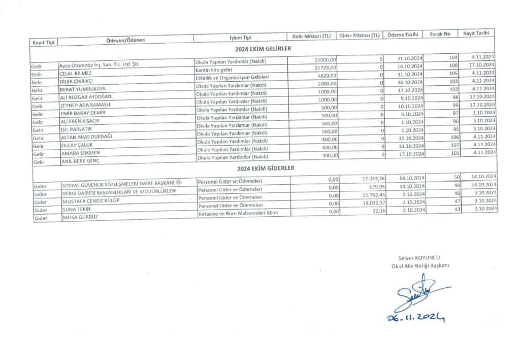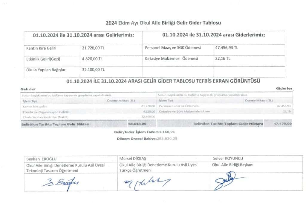Okulumuz Okul Aile Bilriğine ait Ekim 2024 dönemi gelir gider tablosudur.